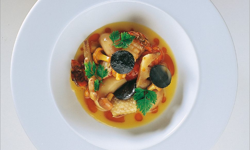 Abattis de poulet de ferme, crêtes et rognons de coq mijotés aux champignons sauvages et écrevisses « pattes rouges » à la façon d’alain chapel