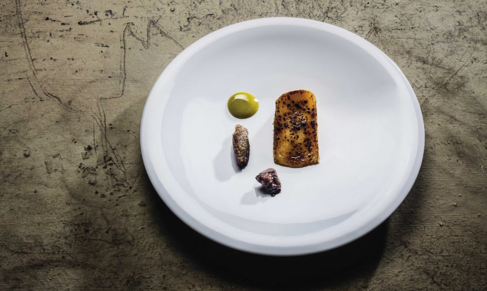 L'abbaye de Cîteaux prend ici l'apparence d'une crème brûlée. Une nouvelle façon de déguster du fromage, avec de la myrtille écrasée au pilon, une huile au poivre et une poire au cumin.