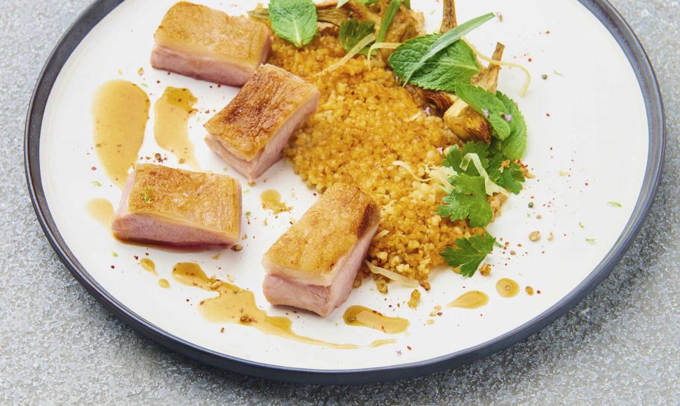 De la selle d'agneau revenue au beurre et quelques aromates parfumés, accompagnée de boulgour gratiné et d'artichauts rôtis.