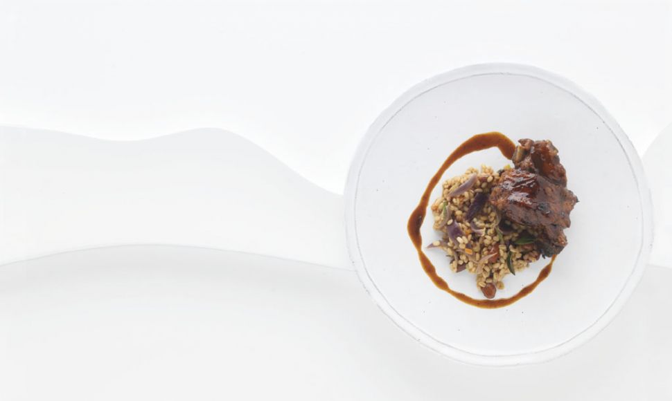 Agneau braisé, orge perlé, violetta et amandes