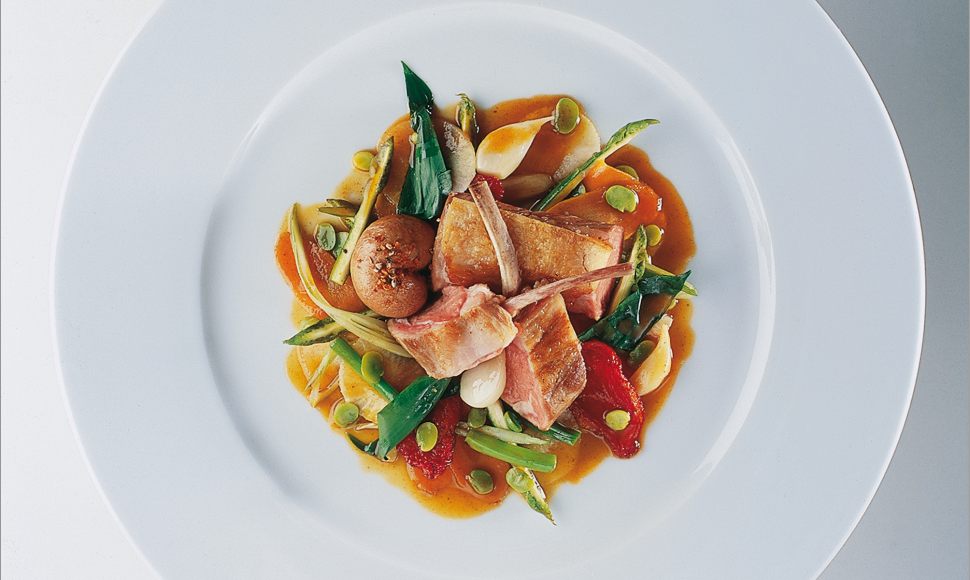 Agneau de lait des pyrénées côtes et filets rôtis, légumes de printemps au sautoir, jus d’un navarin