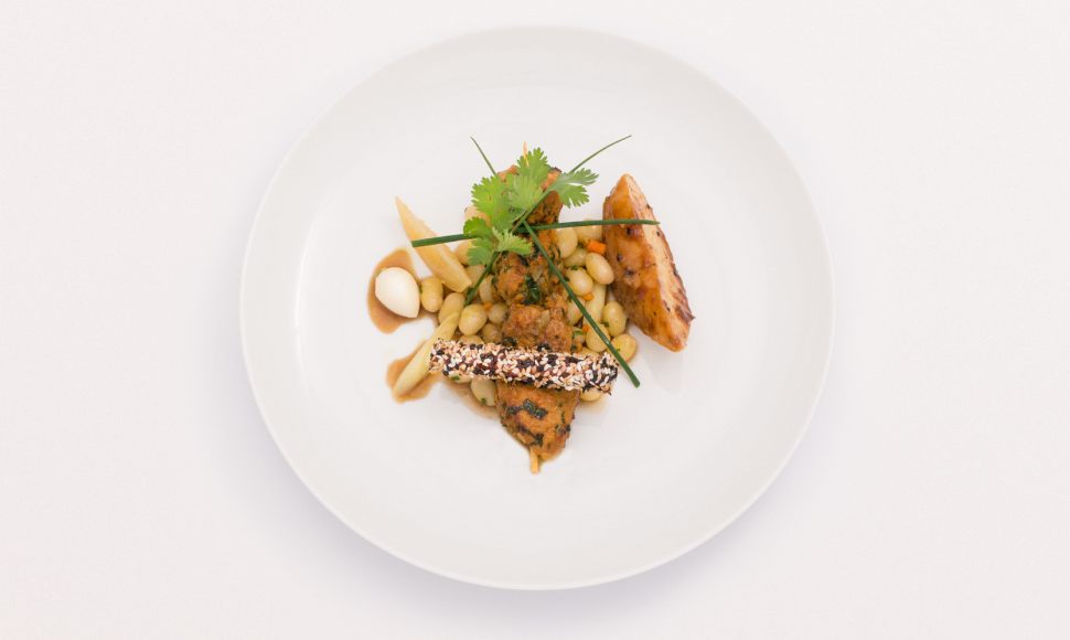 Déposez deux cuillères à soupe de haricots cocos de Paimpol au centre de l’assiette. Disposez le coing côté peau sur l’assiette, puis la brochette au centre. Décorez avec l’ail confit, et le brin de citronnelle.