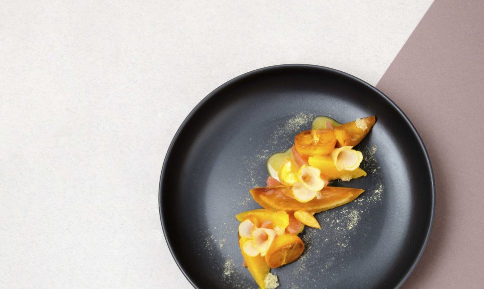 Un assortiment d'agrumes frais, fumés, rôtis et confits, sur un condiment riz-agrumes.
