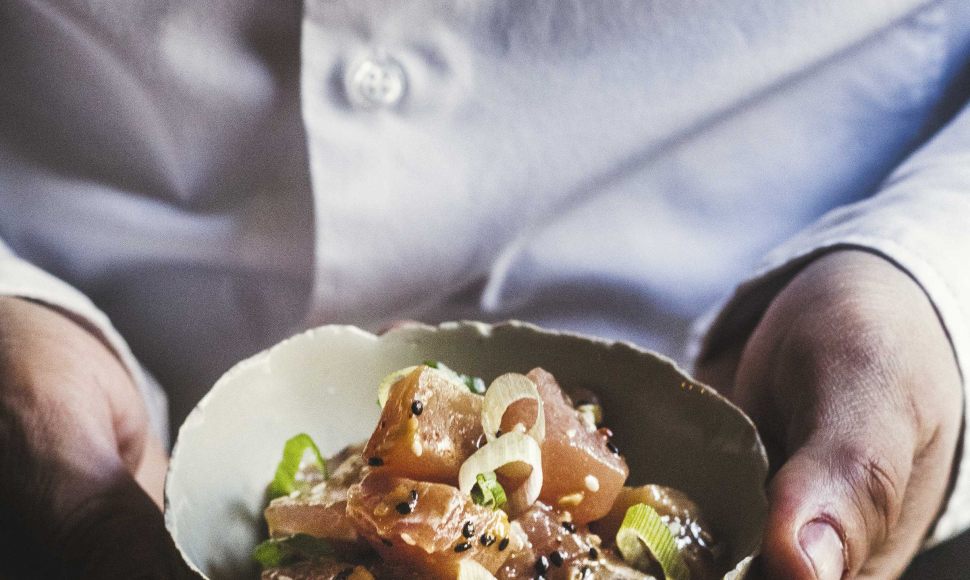Du thon rouge de ligne de Saint-Jean-de-Luz cru coupé au couteau, le tout assaisonné au vinaigre de riz, au wasabi et aux graines de sésame. C'est frais et tonique, comme une vague hawaïenne...