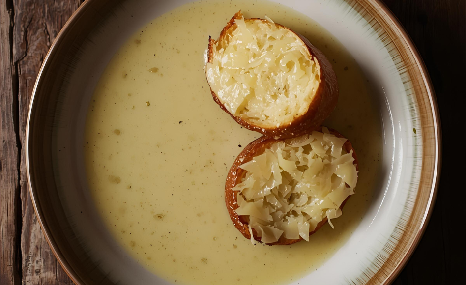Une soupe à base d'ail, de sauge et de laurier versée sur du pain grillé avec du comté : une recette provençale qui ne manque pas d'air !