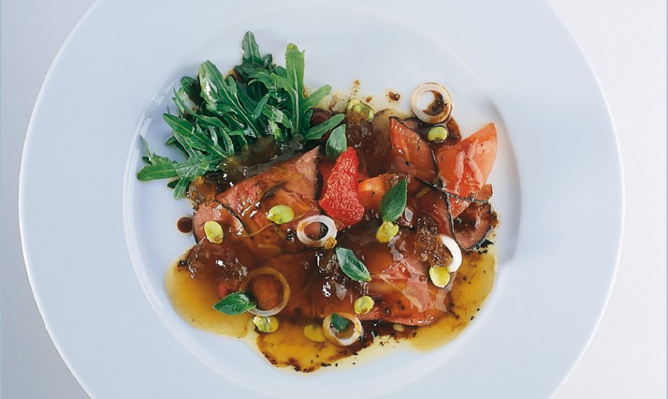 Aiguillette de bœuf en gelée naturelle, tomates, olives et oignons grelots, jeunes salades