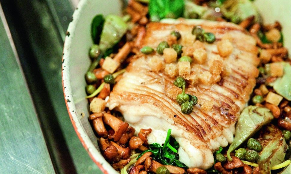 Aile de raie à la grenobloise, girolles et artichauts au citron confit