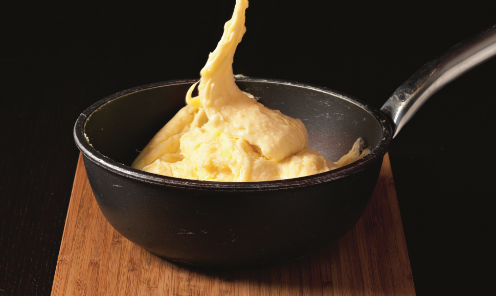 Versez dans la purée les morceaux de tomme en remuant constamment pendant 10 à 15 min à feu vif, afin d’obtenir une purée qui « file ». Servez aussitôt l’aligot dans la cocotte.