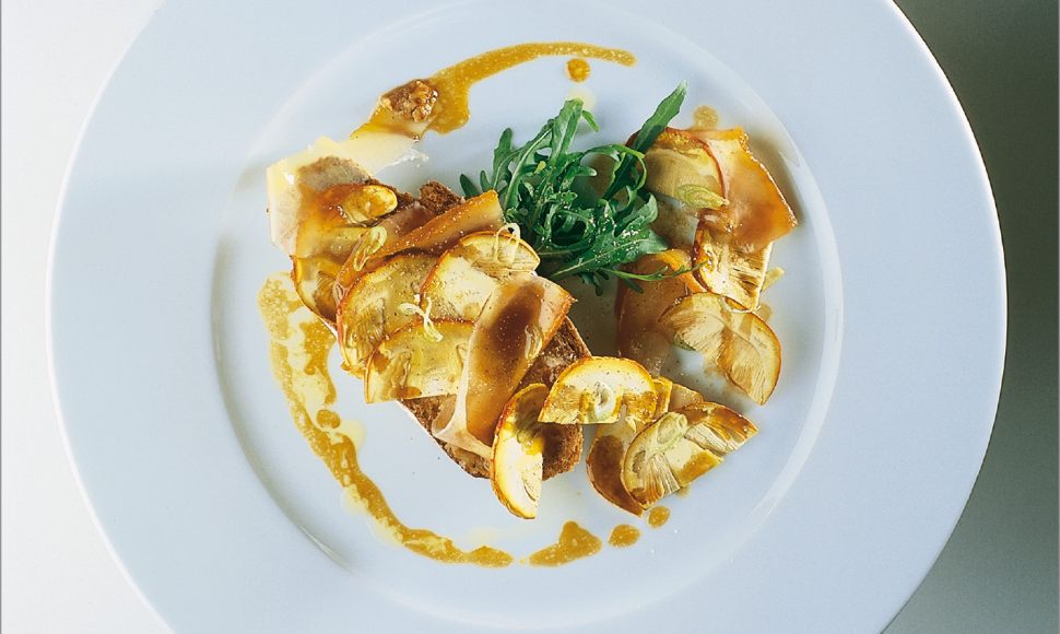 Amanites des césars en fin copeaux, jambon de jabugo, pain de campagne oint d’ail