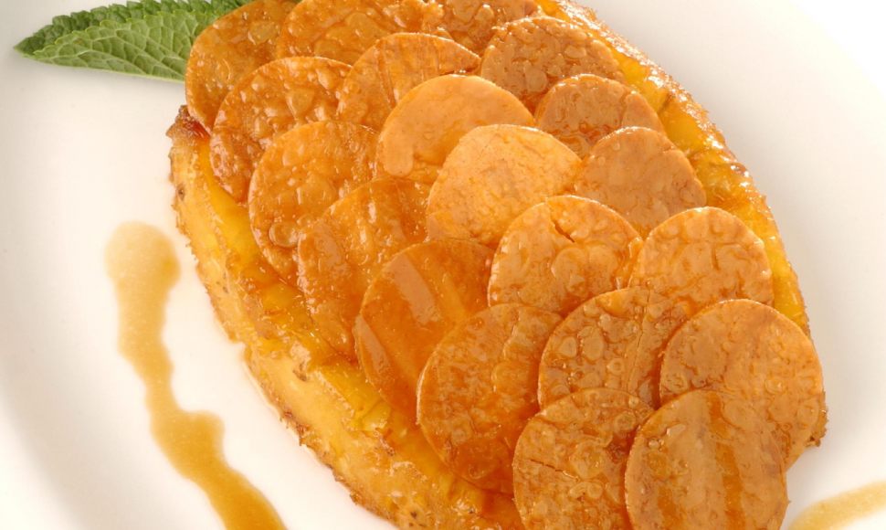 Ananas rôti en écailles croustillantes, crème au rhum de la Martinique, son jus