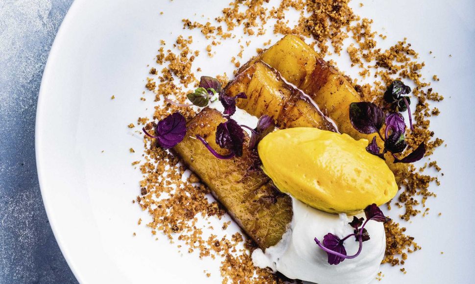 Un dessert à base d'ananas rôti à la poêle, panna cotta vanille, crumble à l'huile d'olive et sorbet fruits exotiques.