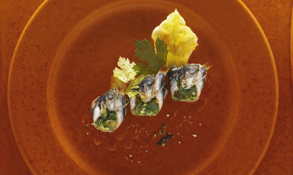 « Alici a beccafico » est une recette de Calabre mais dont on retrouve des équivalents dans tout le Mezzogiorno. Nous avons rehaussé la farce de raisins secs, de pignons et de riquette sauvage.