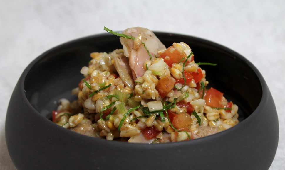 Concasser l’épeautre. Le couvrir d’eau et le laisser tremper à température ambiante pendant 30 minutes. L’égoutter et le réserver.