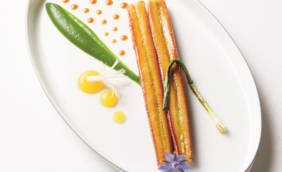 Entre tradition rhénane et créativité contemporaine, Olivier Nasti sublime l’anguille en la fumant délicatement pour en révéler toute la profondeur aromatique. Accompagnée de saveurs végétales et acidulées qui équilibrent son gras fondant, cette recette incarne la signature du chef alsacien : un hommage au terroir revisité avec élégance et précision.