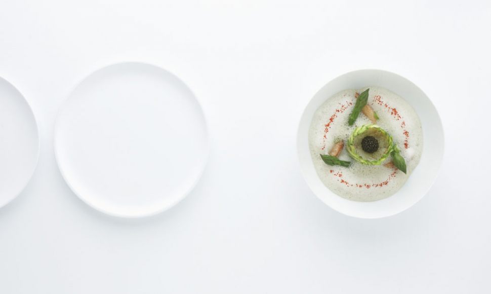 Araignée de mer décortiquée, asperges vertes, émulsion fumée