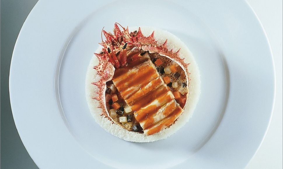 Araignée de mer en coque liée de corail, jeunes légumes en macédoine