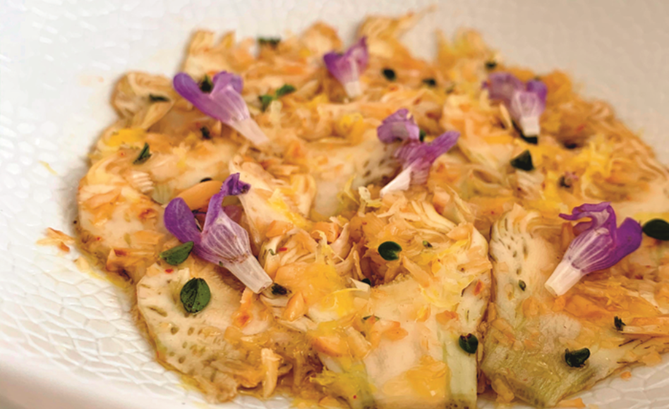 Le chef Arnaud Faye aime travailler l'artichaut dans toutes ses variétés : épineux, de Macau et les petits artichauts violets utilisés dans cette recette de carpaccio. L'artichaut y est à son aise aussi bien cru que cuit, s'accorde à merveille avec le citron et les herbes aromatiques.