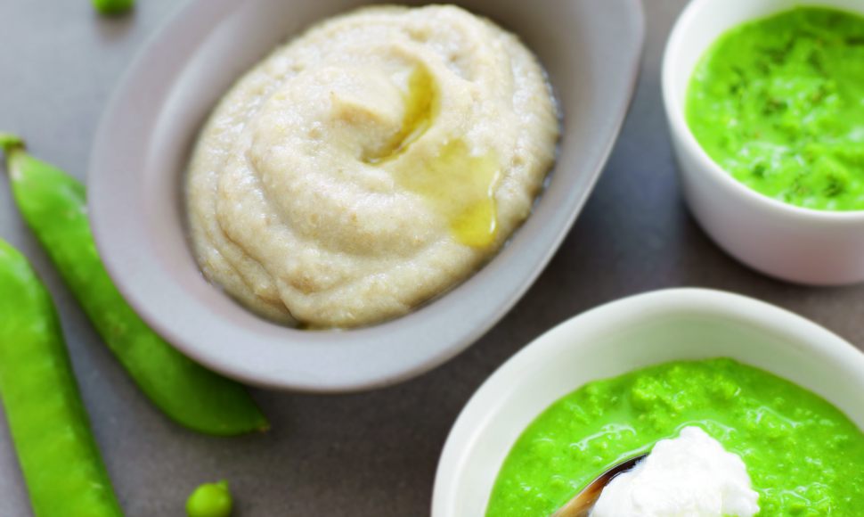 Écossez 200 g de petits pois frais. Épluchez 1/4 d’oignon blanc moyen et émincez-le. Faites cuire ces légumes à la vapeur avec 1 brindille de sarriette. Retirez-la avant de mixer avec du lait2e âge. Ajoutez 1 noisette de beurre demi-sel (5 g) dans cette purée.