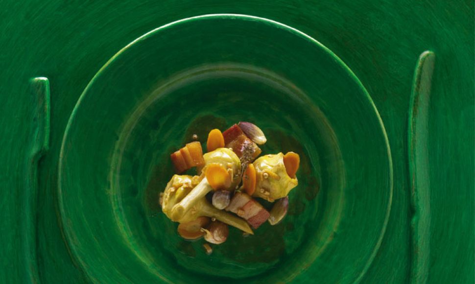 Introduit en France au XVIe siècle depuis l’Italie, l’artichaut est reconnu comme source de revenu importante pour les jardiniers de la Provence dès le XVIIe siècle. On commence à voir apparaître des recettes d’artichauts à la barigoule à partir du XVIIIe siècle, farcis ou sans farce. Cette version « maigre » a perduré. Nous l’avons affinée.