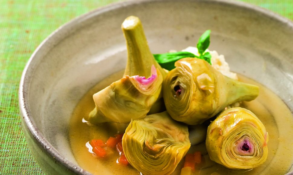 D’origine provençale, la recette des artichauts à la barigoule est très ancienne. Alain Ducasse vous propose de réaliser sa version, en faisant cuire les artichauts avec du lard de campagne, des oignons émincés, de l’ail et une brunoise de céleri et de carotte. Laissez mijoter le tout, ajoutez un bouillon de volaille et du vin blanc. Servez ce plat haut en saveurs avec de la brousse de brebis et des feuilles de basilic. Un délice.