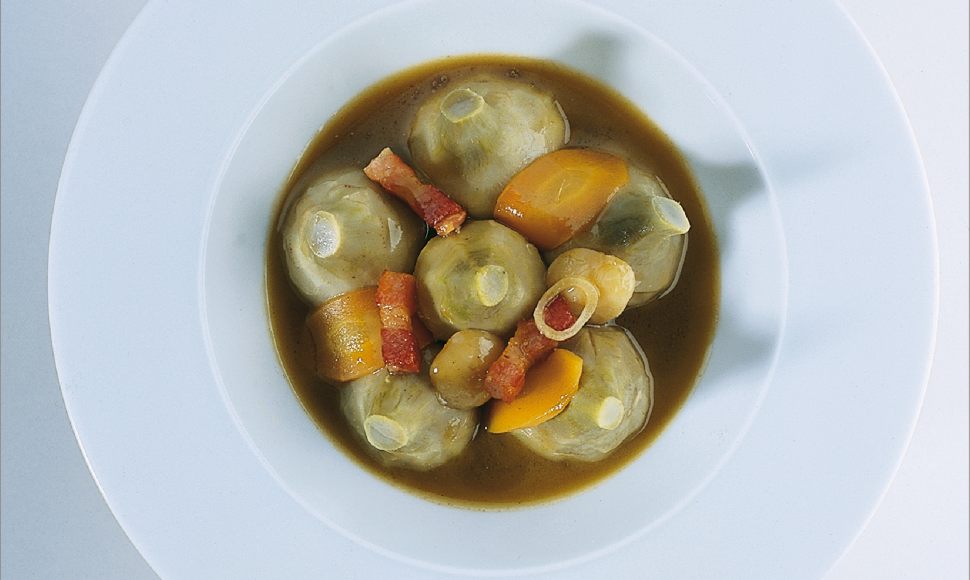 Retirer les feuilles sèches et dures des artichauts. Couper les queues à 3 cm du fond et les parties dures des feuilles. Eplucher le pied comme une asperge. Retirer le foin et réserver les artichauts au fur et à mesure dans un récipient d’eau froide additionnée d’acide ascorbique (1 g par litre d’eau). Récupérer les feuilles se trouvant sur les pieds. Prendre les plus petites, les plus blanches, et les mettre directement dans un récipient d’eau froide.
