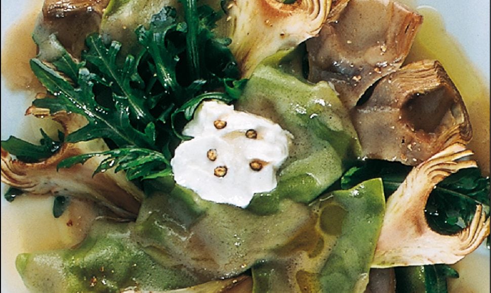 Artichauts violets fondants, d’autres en fins copeaux, roquette et géométrie de pâtes, caillé de brebis cassé
