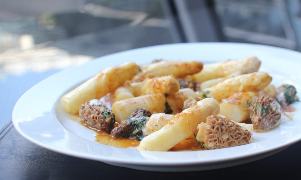 Asperges blanches au vieux comté, étuvée de morilles, jus de rôti au Vin Jaune