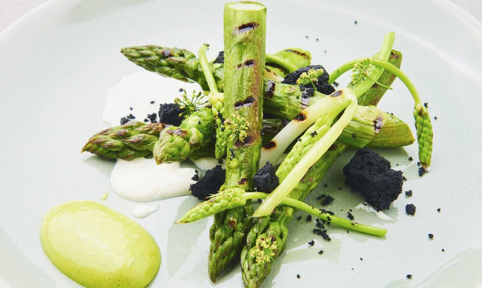 Une assiette fine déclinant les asperges tantôt denses et généreuses, tantôt fluettes et croquantes, accompagnées de comté charbonneux et d'un sabayon menthe-persil frais et aérien.