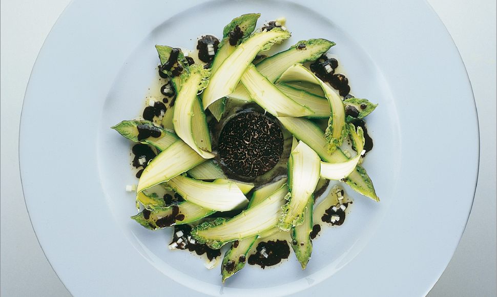Asperges vertes de chez robert blanc cuites et crues, sauce pilée de truffe noire