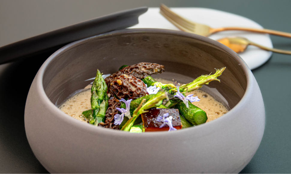 Les asperges, saisies à la minute, conservent leur croquant naturel. Les morilles, longuement mijotées, apportent profondeur et gourmandise. L’émulsion au vin jaune enveloppe l’ensemble d’une touche aérienne, subtilement beurrée, qui prolonge le printemps en bouch