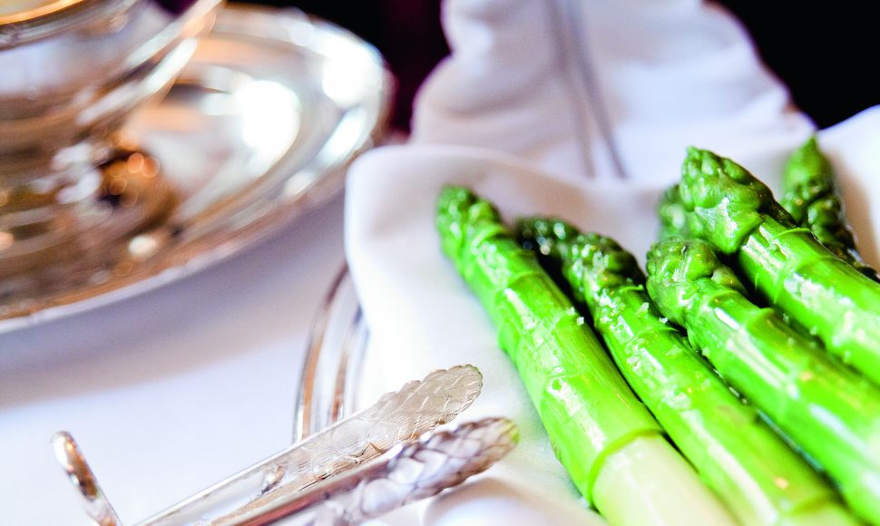 Lavez les asperges, coupez la partie blanche et épluchez-les à l’aide d’un économe. Retirez ensuite les petites feuilles restantes à l’aide d’un couteau d’office. Réalisez deux bottes de 14 asperges, ficelez-les bien et plongez-les dans un bain d’eau glacée. Faites bouillir de l’eau avec le gros sel dans une grande casserole, puis plongez-y délicatement les deux bottes d’asperges. Sondez la partie la plus épaisse des asperges avec la pointe d’un couteau pour vous assurer qu’elles sont bien cuites, puis plongez-les immédiatement dans un bain d’eau froide pour stopper la cuisson.