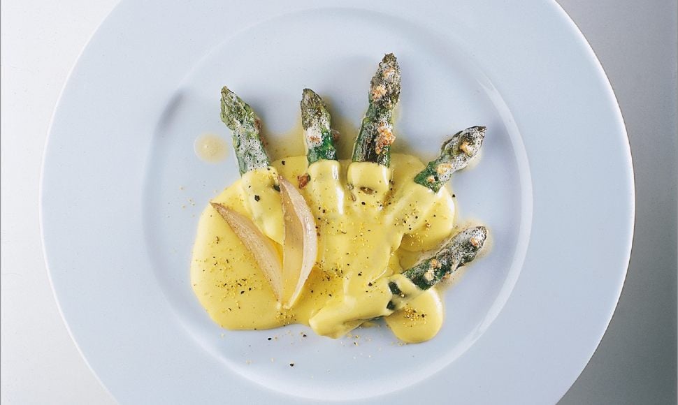 Asperges vertes de villelaure cuisinées à cru façon meunière, échalote grise nouvelle, sabayon citronné