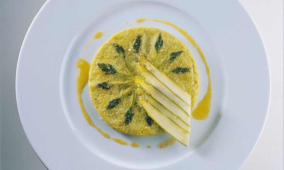 Dans un sautoir, faire chauffer un filet d’huile d’olive, ajouter les rondelles d’asperge, les saler et les faire fondre sans coloration. Ajouter le fond blanc de volaille et les cuire à couvert en maintenant un léger frémissement.