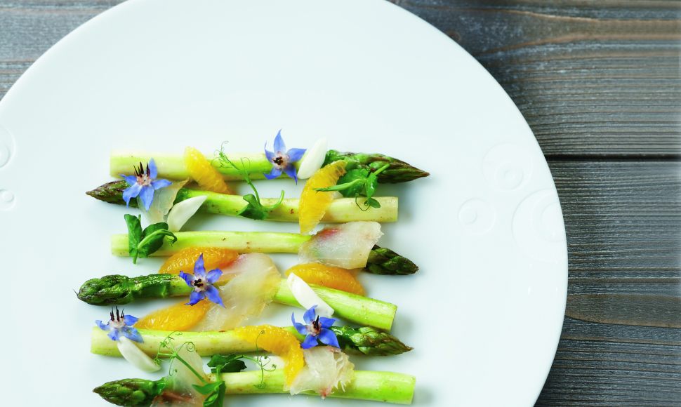 C’est l’association de la terre et de l’eau. Un pur produit terreux qu’est l’asperge, avec la douceur d’un poisson de lac légèrement fumé. La féra fumée s’imposait à nous comme une évidence. L’orange sanguine vient réveiller ce plat par sa fraîcheur.