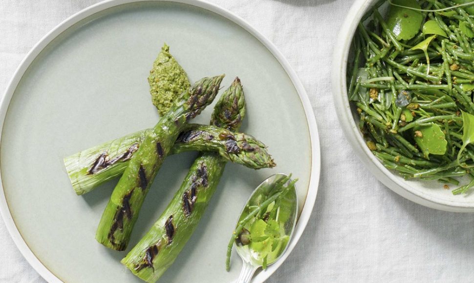 Des asperges vertes accompagnées d'un condiment végétal salicorne-asperge-pistache, ainsi que d'une salade marine algues-salicorne d'une grande fraîcheur.