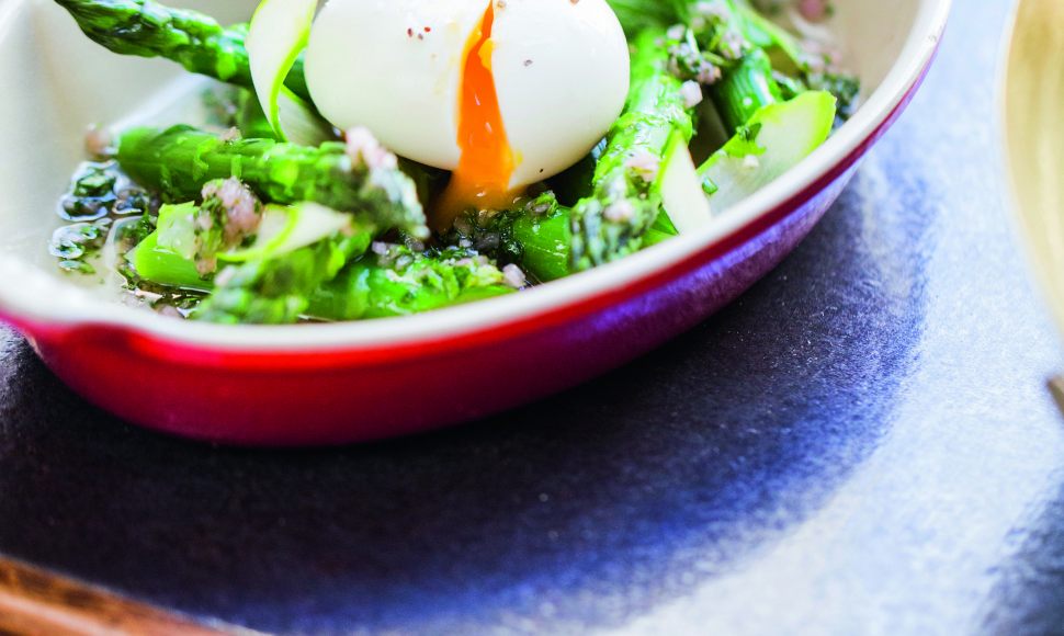 Une entrée coquette qui ne manque pas de goût : asperges vertes croquantes, œuf mollet encore coulant et sa vinaigrette puissante par Alain Ducasse et Laétitia Rouabah.