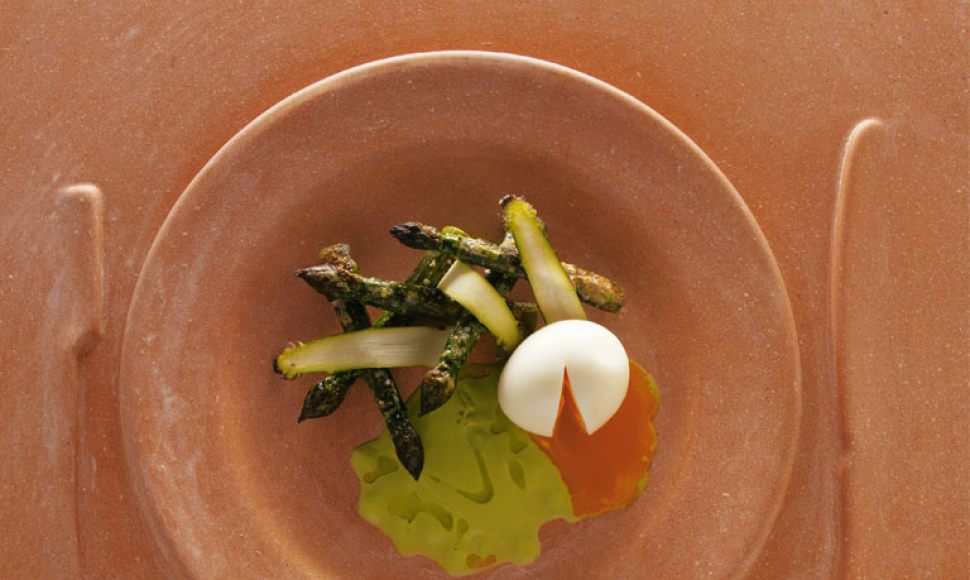 "Gli asparagi al burro (Les asperges au beurre) sont une préparation familiale ligure pour les jours de printemps. On aime en Ligurie, comme dans les régions méridionales, les petits légumes peu cuits. Nous y avons ajouté un coulis et un œuf mollet dont la finesse se marie bien avec les asperges."