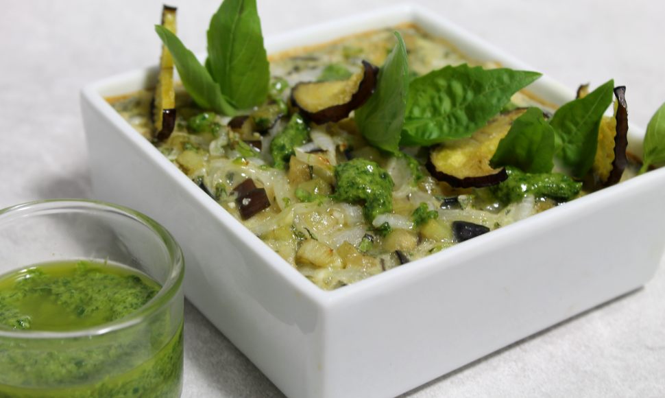 Pour une entrée chaude et savoureuse, optez pour cette recette gourmande. Découpées sous plusieurs formes, les aubergines ont été cuisinées de différentes façons afin d'apporter plusieurs textures à ce plat. Très parfumées, les aubergines sont assaisonnées d'un pistou fait maison. Un passage au four plus tard et vous n'avez plus qu'à déguster.
