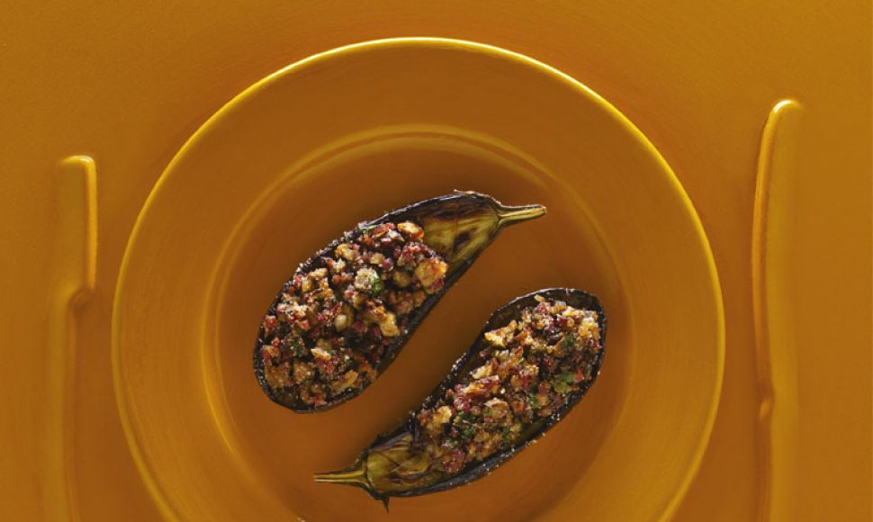 Laver et sécher les aubergines. Au milieu de chacune d’elles et dans leur longueur, tailler deux tranches (soit quatre en tout) en conservant le pédoncule. Avec la pointe d’un couteau, inciser la chair de ces tranches et celle de tous les autres morceaux.
