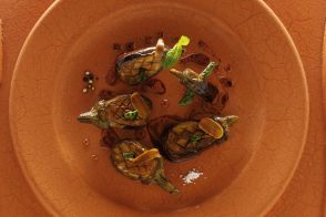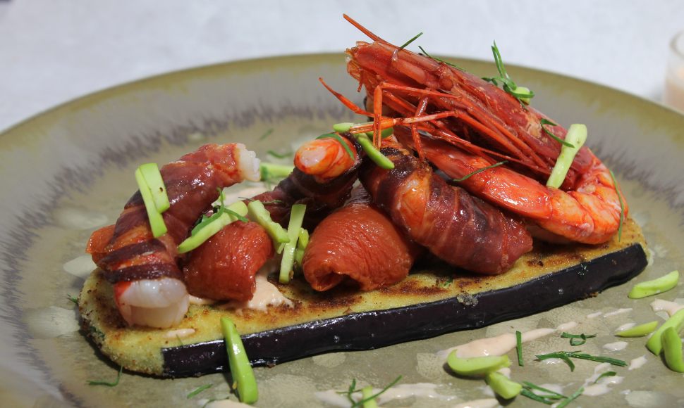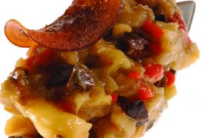 Cette recette est inspirée de celle des « Berenjenas con jamon », de Margarita Martiñez Quintana, servie dans la province de Valence et plus précisément à Murcia. Nous l’avons débarrassée de sa béchamel, avons ajouté des févettes, des tomates confites et un fin condiment.