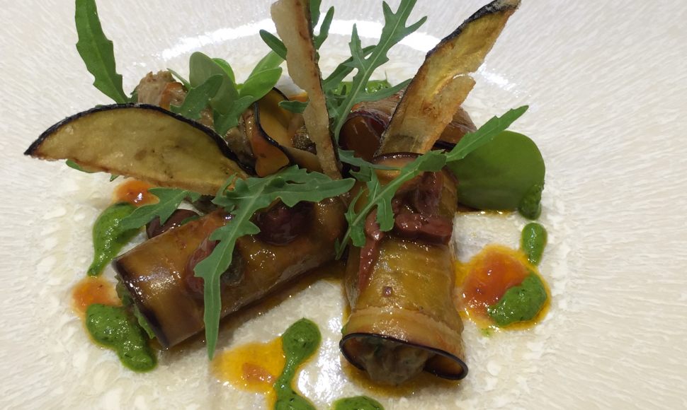 Rincer, essorer, sécher et équeuter la roquette. Égoutter 4 tranches d’aubergines de leur marinade et les réserver. Sur toutes les autres, déposer une cuillerée de caviar d’aubergine et les rouler comme un cannelloni. Les disposer dans un plat ou sur les assiettes et ajouter les 4 tranches réservées. Assaisonner avec la marinade. Ajouter les tranches d’aubergines frites et les brins de roquette.