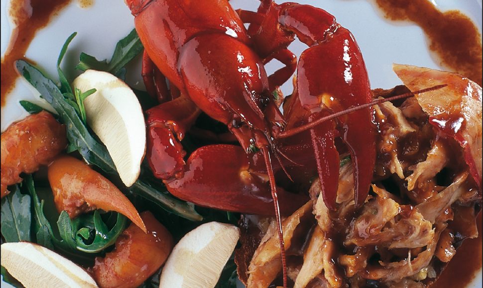 Avants de lapereau fermier en rillettes, tartine de pain de campagne sur la braise, écrevisses « pattes rouges », sucs de cuisson réduits