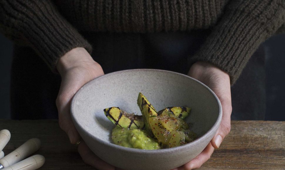 Mélangez le zeste et le jus de citron vert avec le miel, la mélisse et une pincée de piment d’Espelette. Émulsionnez à l’huile d’olive.