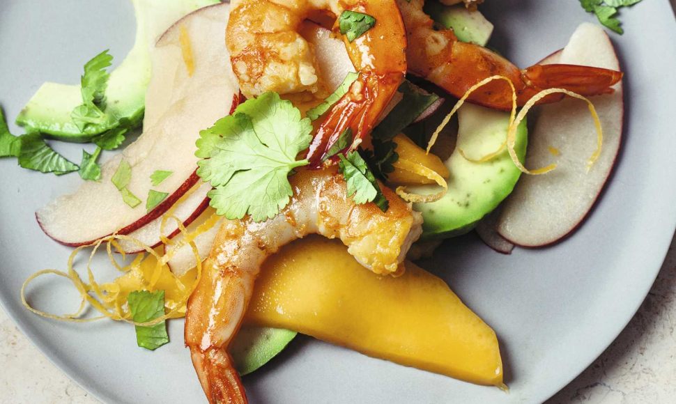 Une salade sucrée-salée à base d'avocat, mangues, pommes et crevettes avec un jus de citron et piment d'Espelette.