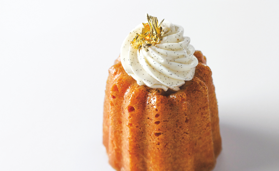 Un délicieux baba au rhum, dont la forme rend hommage au plus célèbre des gâteaux de la région. Hommage gourmand au grand classique du Sud-Ouest, ce baba cannelé révèle toute la finesse d’une pâte bien levée infusée aux agrumes, imbibée d’un sirop parfumé au rhum, et surmontée d’une ganache aérienne à la vanille. Une alliance savoureuse entre moelleux, caractère et élégance qui invite à la dégustation — signe d’un chef pâtissier soucieux d’équilibre et d’émotion.