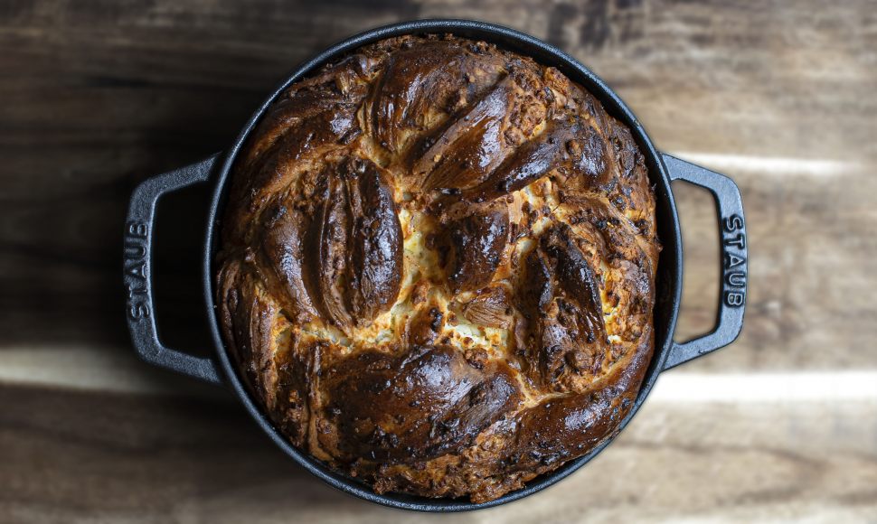 Originale, la babka salée à la feta, aux herbes et aux fleurs. Cette recette a été imaginée par la cheffe Alessandra Montagne et réalisée dans la cocotte en fonte Staub noire de 20 cm de diamètre.