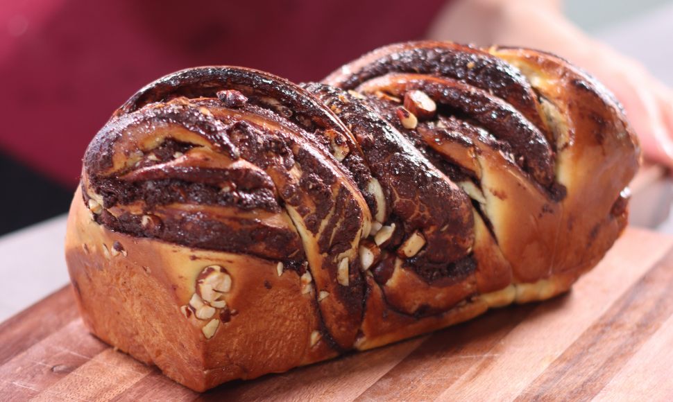 Étaler une couche uniforme de garniture au chocolat, et disposer des noisettes concassées. Rouler le rectangle dans le sens de la longueur, puis inciser le boudin ainsi obtenu en deux brins. Tresser les deux brins et disposer la natte ainsi obtenue dans un moule à cake rectangulaire, et laisser reposer une heure à température ambiante. Préchauffer le four à 180 degrés et enfourner 20 minutes.