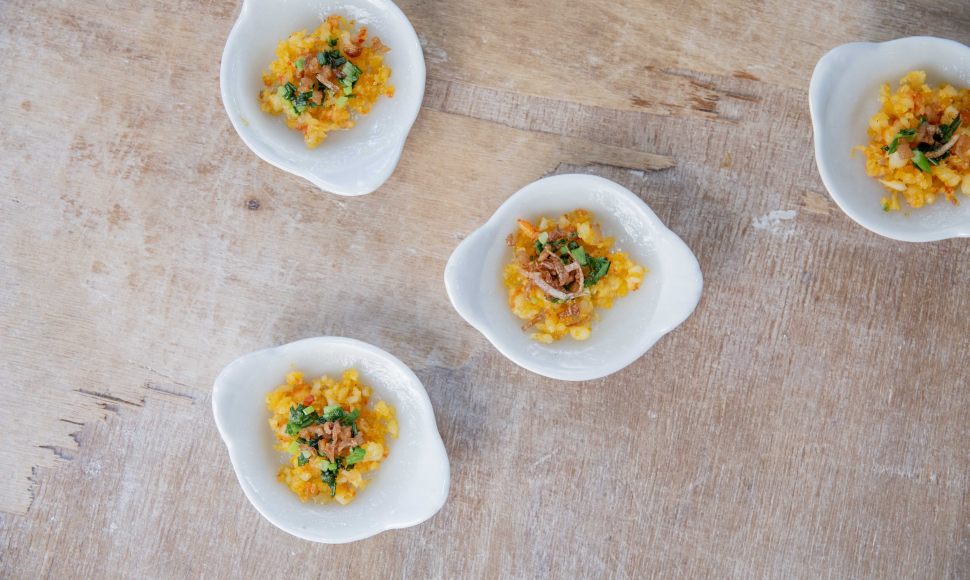 Les Bánh bèo sont des petites galettes de riz gluant, farcies aux crevettes avec des cébettes, de l'ail et des échalotes.