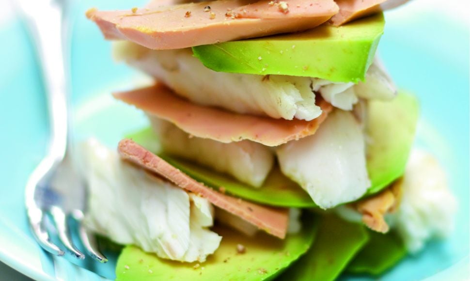 Un étrange mélange que celui-ci, né d'un pis-aller. Au cours d'une journée de tournage en studio, après avoir cuisiné un bar, un foie gras et je ne sais quoi à l'avocat, je me fis, à la va-vite, une assiette pour déjeuner en piochant dans tous les plats. Le résultat fut ce " mille-feuille " où ces trois produits se suffisaient à eux-mêmes et n'avaient besoin d'aucun autre assaisonnement pour briller.