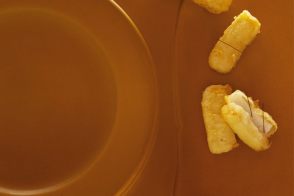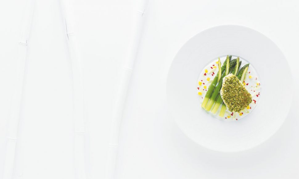 Bar chilien, viennoise pistache/macadamia, condiment noix de coco/citronnelle, asperges vertes
